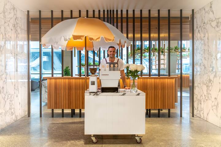 Profitez d'un moment café agréable directement pendant votre séjour Airbnb. Notre chariot à café Captain&Co arrive entièrement équipé avec un barista professionnel, du café Single O de spécialité et une sélection de pâtisseries fraîches.