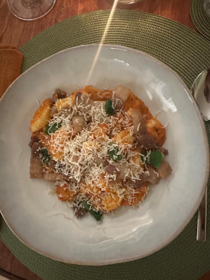 Entrée, plat de pâtes, plat de poisson, plat de viande et dessert