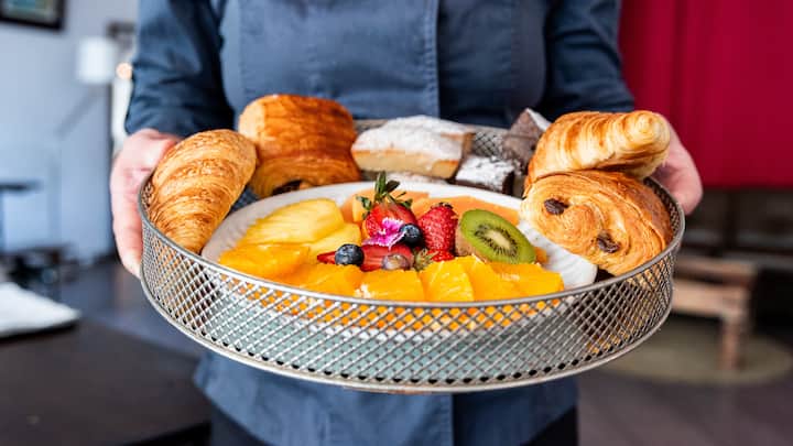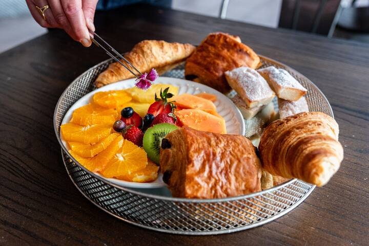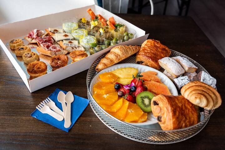 Livraison au port de Barcelone, directement sur la plateforme du bateau. Comprend des croissants français, des mini-pains au chocolat, des madeleines ou des financiers, des mini-burgers brunch, des mini-quiches françaises, du jambon ibérique et de la charcuterie, une sélection de fromages, des brochettes de tomates cerises et de mozzarella, des brochettes de fruits de saison, de l'avocat et des œufs, de la focaccia artisanale et du pain rustique avec du beurre. Serviettes et ustensiles biodégradables fournis.