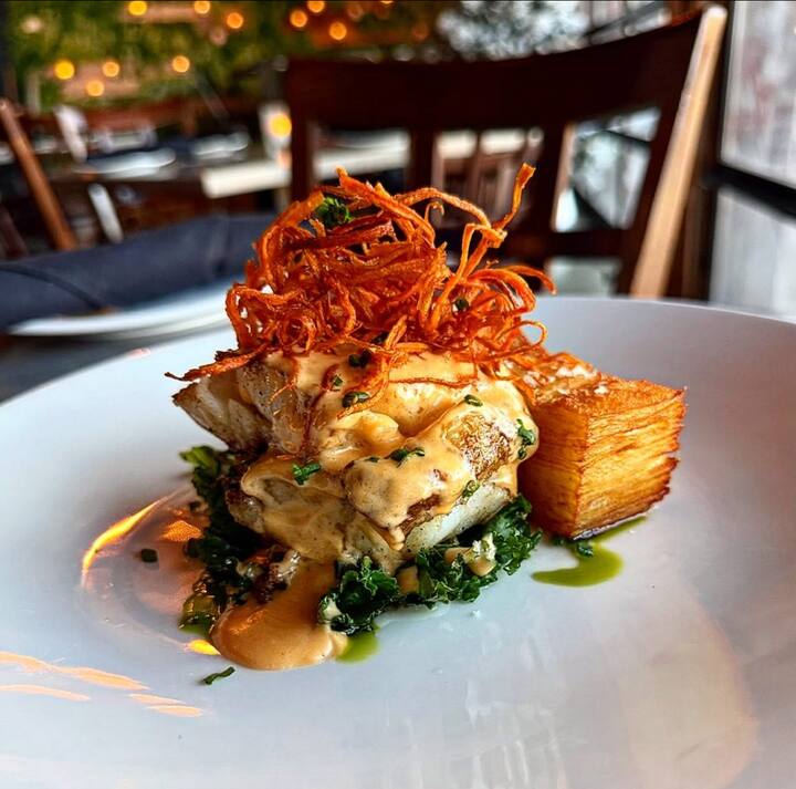 Steaks de premier choix et fruits de mer sauvages grillés sur un foyer ouvert. Les accompagnements comprennent de la purée de pommes de terre, des asperges, des carottes roses, des macaronis au fromage et de la crème d'épinards. Un gâteau au chocolat hollandais avec une mousse à la guimauve et une gastrique estivale à la framboise viennent compléter le repas.