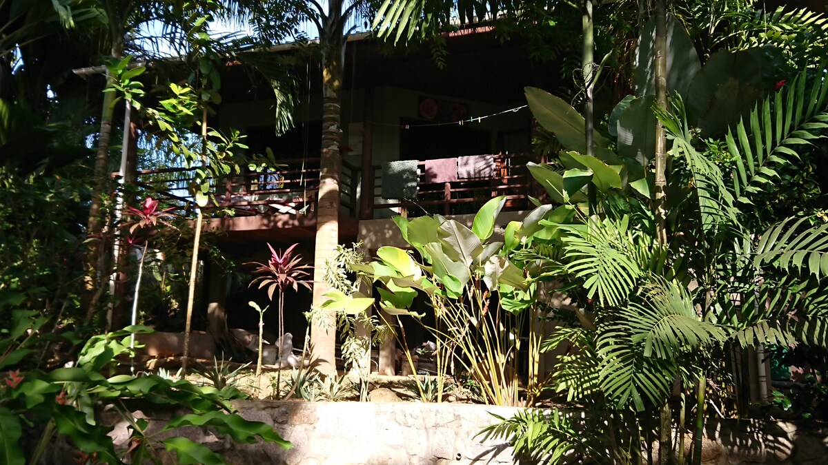 Le bungalow est traditionnellement construit, il repose sur des piliers dans un grand jardin dans lequel deux autres maisons sont louées. La maison n'a pas DE CLIMATISATION. Les fenêtres ont des stores en bois avec des persiennes, l'air circule sous la maison et à travers toutes les pièces. C'est tellement bon de se détendre sur la véranda ouverte, d'observer des fleurs et des oiseaux tropicaux, des geckos et des insectes, des poulets, des chats, des renards volants. Pas de fenêtres en verre, pas de piscine. Au lieu de cela, de beaux bois et de la nature, de l'air frais, des moustiquaires et une connexion Wi-Fi gratuite.