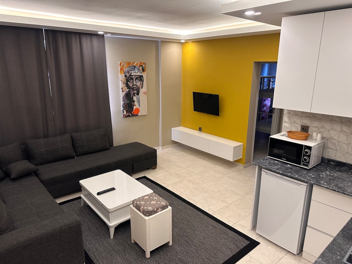 Mali Garden Residence. sidestork. Notre appartement de luxe au concept 1+1 au bord de la piscine est à 700 m de la mer et à 200 m des centres commerciaux. Le bâtiment est neuf et tous les appareils électroménagers et la chambre sont neufs. La piscine a une terrasse. Il y a 8 résidences dans le bâtiment, c'est un site calme. Il y a la possibilité de faire un barbecue dans le jardin et il y a 2 chaises longues. Très adapté aux familles. Nous aidons nos clients dans tous les domaines du mieux que nous pouvons. La gendarmerie et la police sont informées de l'identité.