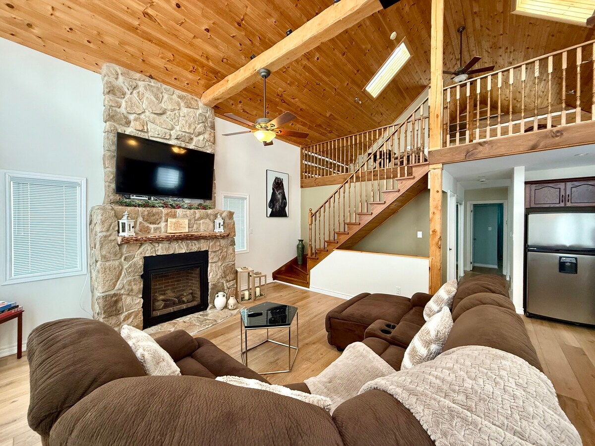 Évadez-vous dans notre paradis au bord du lac ! 3 chambres plus loft et un bunkie saisonnier offrent beaucoup d'espace. Profitez de la cheminée à gaz confortable, avec deux espaces de vie et des jeux pour les enfants. Profitez de la vue sur le lac depuis votre quai privé avec une plate-forme de baignade et détendez-vous autour du foyer. Kayaks à quai gratuits pour vos aventures aquatiques. Votre retraite parfaite vous attend !( AUCUN frais de service Airbnb ajouté !!)