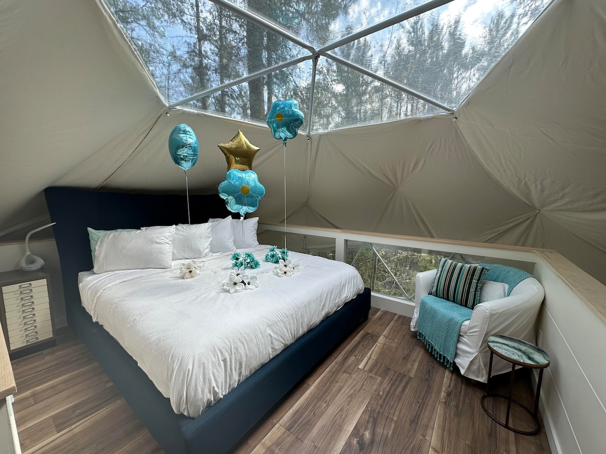 Vous cherchez une escapade rapide près de la ville ? Notre dôme glamping offre une retraite sereine sur 10 acres de sentiers, de ruisseaux et d'un étang paisible. Parfait pour les anniversaires, les anniversaires de mariage et les réunions de famille, il allie nature et luxe. En hiver, profitez du plein air enneigé et restez au chaud à l'intérieur avec le poêle à granulés. Conçu avec soin pour le confort et la romance, avec des équipements haut de gamme et une connexion Wi-Fi rapide, c'est l'endroit idéal pour créer des souvenirs inoubliables.