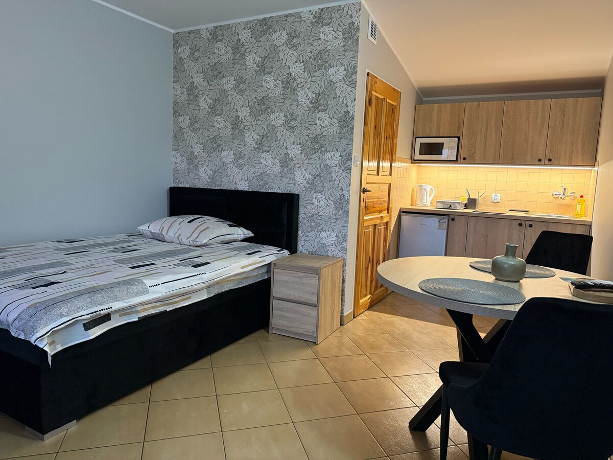 Studio apartment with terrace, equipped with: - Private bathroom - Fully equipped kitchenette - Smart TV In addition, our guests can enjoy: - Shared kitchen - Laundry room - Parking spaces - Free Wi-Fi throughout the property We offer a large garden with a fireplace and barbecue area, as well as a volleyball and soccer field. Excellent location: - 250m to the beach - 2km to the Powidz Military Base Discount for a long-term stay and cleaning service free of charge.