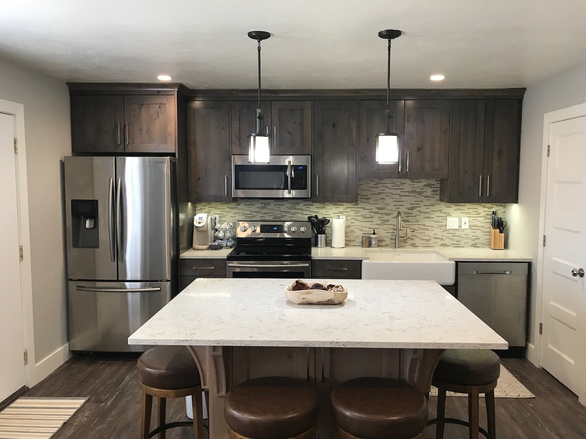 L'Aspen Lodge est un appartement de sous-sol moderne et confortable situé au centre de Salt Lake City. Un accès gratuit et facile vous permet de vous rendre rapidement aux attractions locales et aux célèbres stations de ski de l'Utah. L'appartement fait 1 500 pieds carrés avec une grande pièce ouverte avec une cuisine complète, un foyer au gaz, une télévision et une table de billard. Nous disposons de 2 chambres confortables (king et queen), de 2 salles de bains et d'un poste de travail avec un bureau debout. L'Aspen Lodge est parfait pour les voyages d'affaires et les vacances.