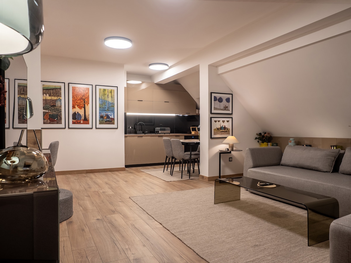 Découvrez un loft confortable et élégant sur un boulevard central près de l'emblématique Pont des Aigles, avec un accès facile au métro, à la cathédrale Alexandre-Nevski et à d'autres commodités. Il dispose d'un salon spacieux et accueillant qui est parfaitement adapté pour vos tâches professionnelles et vos besoins de détente. Vous profiterez d'une connexion Wi-Fi rapide, d'une cuisine bien équipée, d'un lave-linge et d'un lit confortable pour un sommeil réparateur. De plus, du café gratuit est fourni, de l'eau propre et tout ce dont vous avez besoin pour vous sentir comme chez vous.