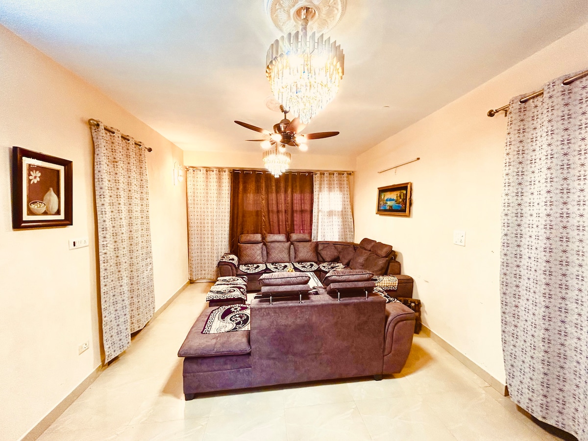 (Pièce d'identité du voyageur obligatoire) Détendez-vous en famille lors de ce séjour paisible. Les couples non mariés sont les bienvenus. Situé dans une belle société avec des restaurants et des magasins. Zomato, Swiggy, Pizza Hut et toutes les options de restauration disponibles. L'appartement est propre, hygiénique et bien éclairé. Musique interdite après 21 h. À proximité : CGC, Université de Chandigarh, Université Rayat Bahra. CP67 et centre commercial VR Punjab – 10 min. ISBT Mohali – 15 min. Hôpital Fortis & Max – 8 min.