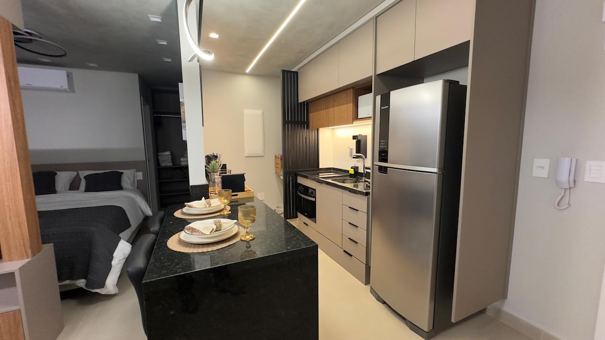Este estúdio foi projetado para oferecer uma experiência única, unindo conforto, estilo e praticidade. A decoração moderna e cuidadosamente planejada cria um ambiente acolhedor e sofisticado — perfeito para relaxar ou trabalhar com tranquilidade. Cada detalhe reflete charme, exclusividade e bem-estar. Reserve e sinta-se em casa! Temos berçinho para receber bebês 👶