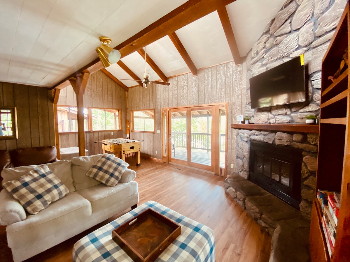 Riverside Retreat est l'escapade parfaite pour votre grande famille ou vos amis de tournois de pêche. La terrasse couverte surdimensionnée offre une vue imprenable sur l'eau, un grand canapé +2 chaises centrées autour d'une table de feu à gaz, une table à manger extérieure pour 10 personnes, un 65in. TV et 2 ventilateurs de plafond. Profitez du foyer avec quatre chaises adirondack et une balançoire extérieure. Le tout nouveau quai est équipé d'un bateau slip + sea doo tie up pour attraper les poissons et le soleil. 4 kayaks - 2 jusqu'à 130lbs et 2 pour adultes. NOUS NE POUVONS PAS ORGANISER D'ÉVÉNEMENTS !