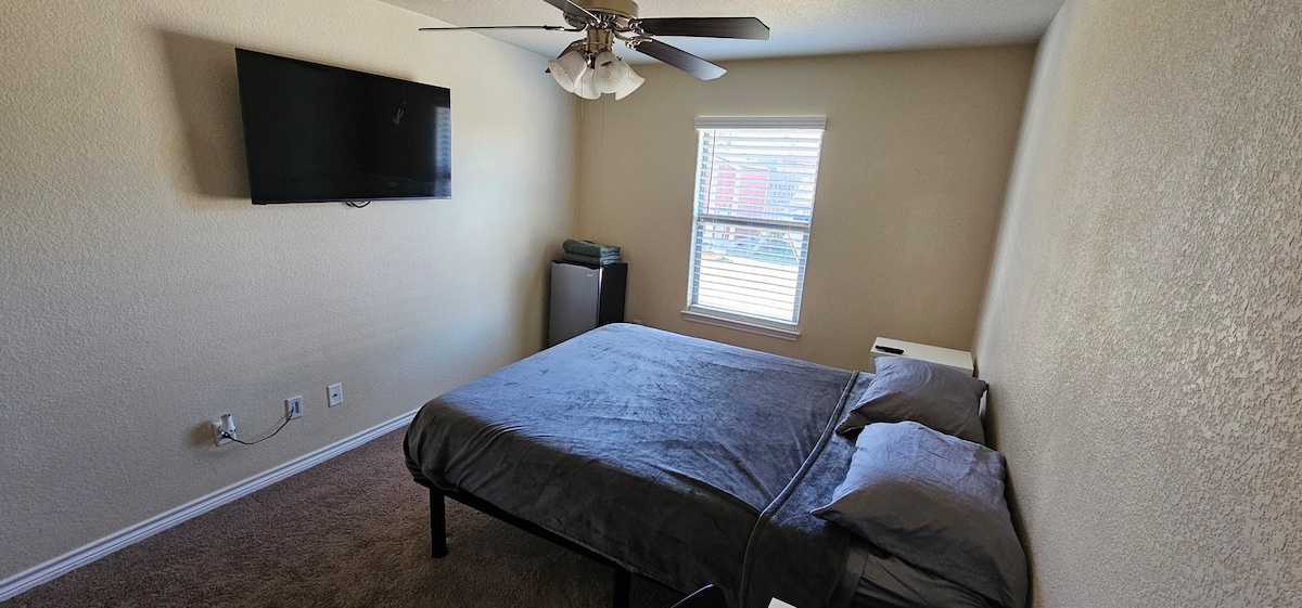 Logement 1B1B confortable près de BSW. Séjours à la semaine ou au mois de préférence. Nous proposons une chambre privée confortable avec un lit Queen Size, un placard, une salle de bain, un bureau, une petite télévision, avec tout ce dont vous avez besoin pour votre visite. Vous serez la seule personne à séjourner dans la maison pendant votre séjour. Accès complet à une salle de bain privée, une cuisine et un salon. Parking privé dans l'allée. Situé près du centre-ville de Temple, à 3 minutes de Baylor Scott et de l'hôpital White, à 15 minutes du lac Belton, à 5 minutes du Bell Event Center. 45 Austin.