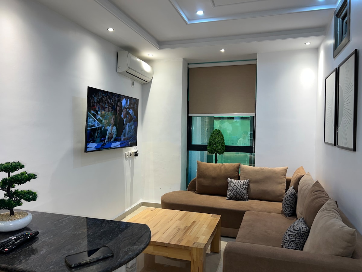 Luxueux 2 pièces de haut standing climatisé dans une résidence sécurisée. Appart neuf offrant toutes commodités. Espace de parking privé avec ascenseur, parc et jardin. Proche de la plage et transports en commun à 15 min du Sheraton et à 2 pas du centre ville. Cuisine entièrement équipée (Four, micro-onde, cuisinière, lave vaisselle, lave linge et électroménager ... ) Salle de bain avec douche, sol réchauffé et mini "Hammam". Une chambre douillette avec lit double, TV et lumières reposantes.