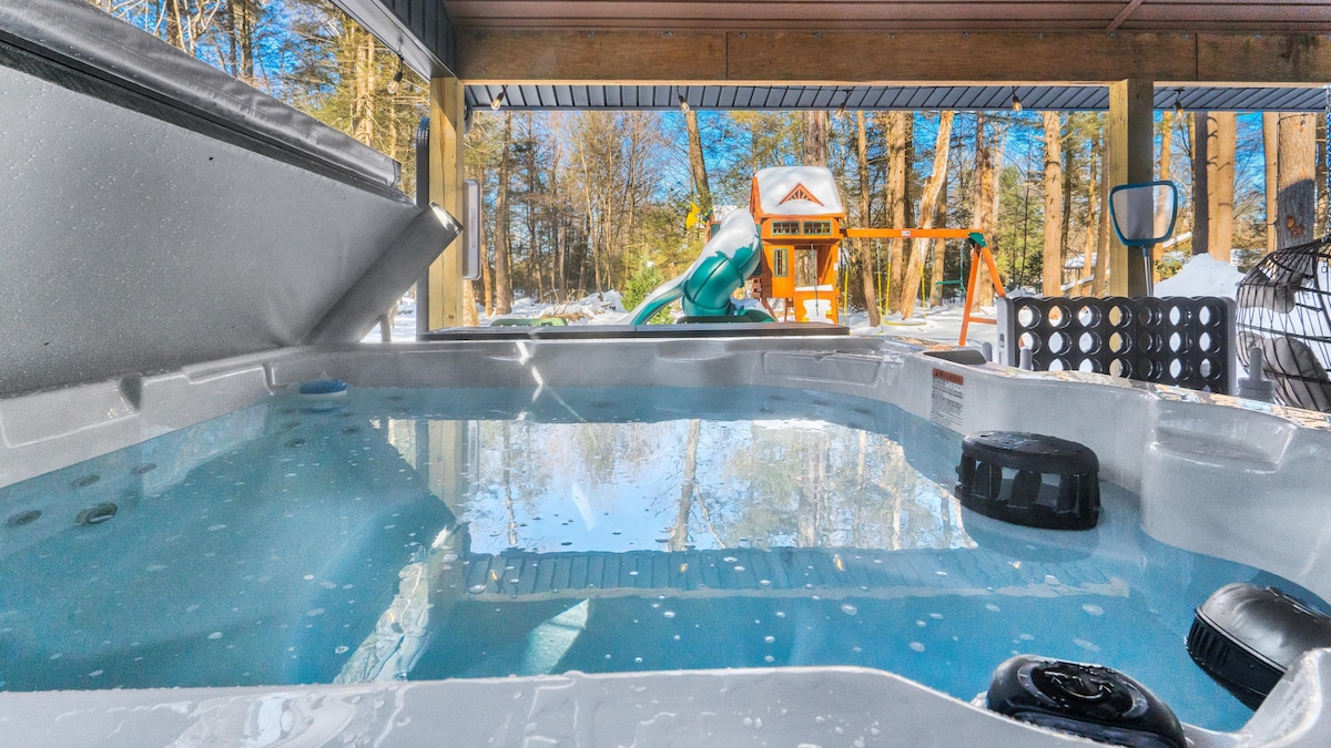 Escape to the Poconos and unwind in our stunning A-frame retreat tucked into the woods. Floor-to-ceiling windows flood the space with natural light, while modern comforts invite you to relax by the fireplace, soak in the private hot tub, or recharge in the outdoor barrel sauna. In warmer months, enjoy nearby lakes, hiking, and fresh mountain air. Come winter, hit the slopes at Big Boulder or Jack Frost, just minutes away. A peaceful, year-round getaway designed to help you truly disconnect.