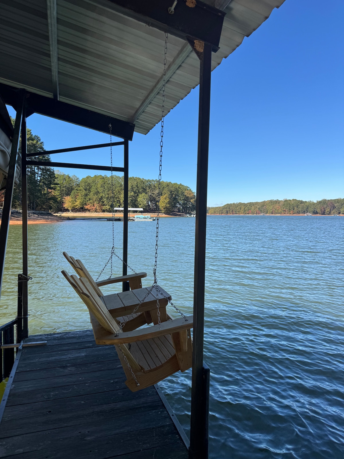 Get away from the daily hustle bustle with calm & relaxing lakeside waters! Our newly renovated home provides a short, easy walk down to your own private dock in a deep water cove. This is your haven on the lake without the water & road traffic of Hartwell. From inside the home, take in the wide lake views from a screened-in patio overlooking the water.
