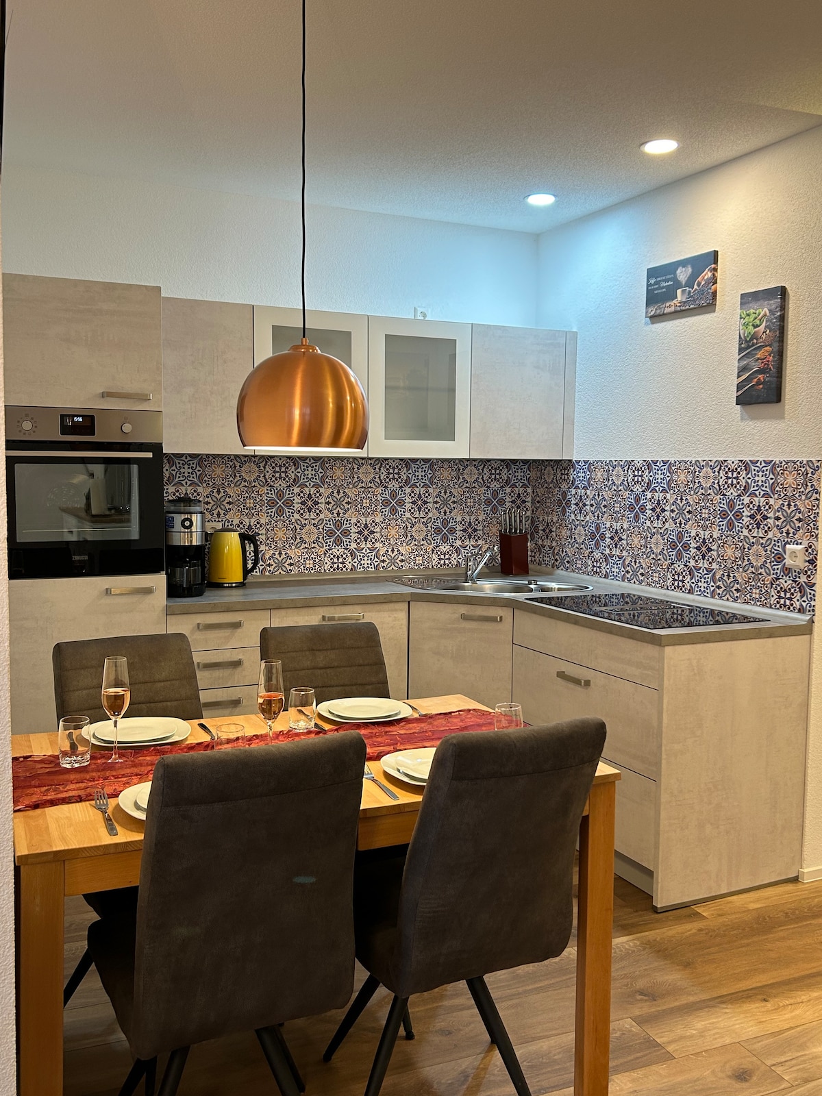 Meublé de façon moderne, lumineux, ensoleillé et de 75 m² : notre appartement de trois pièces au premier étage de notre maison de quatre familles offre beaucoup d'espace pour des vacances de rêve. Une grande cuisine ouverte avec lave-vaisselle, réfrigérateur-congélateur ainsi que télévision et WLAN offrent tout le confort. La chambre est équipée d'un lit double confortable (sommier tapissier) et dispose de son propre accès à la terrasse. Une chambre d'enfants séparée avec lit gigogne et un WC avec une douche spacieuse complètent l'offre.