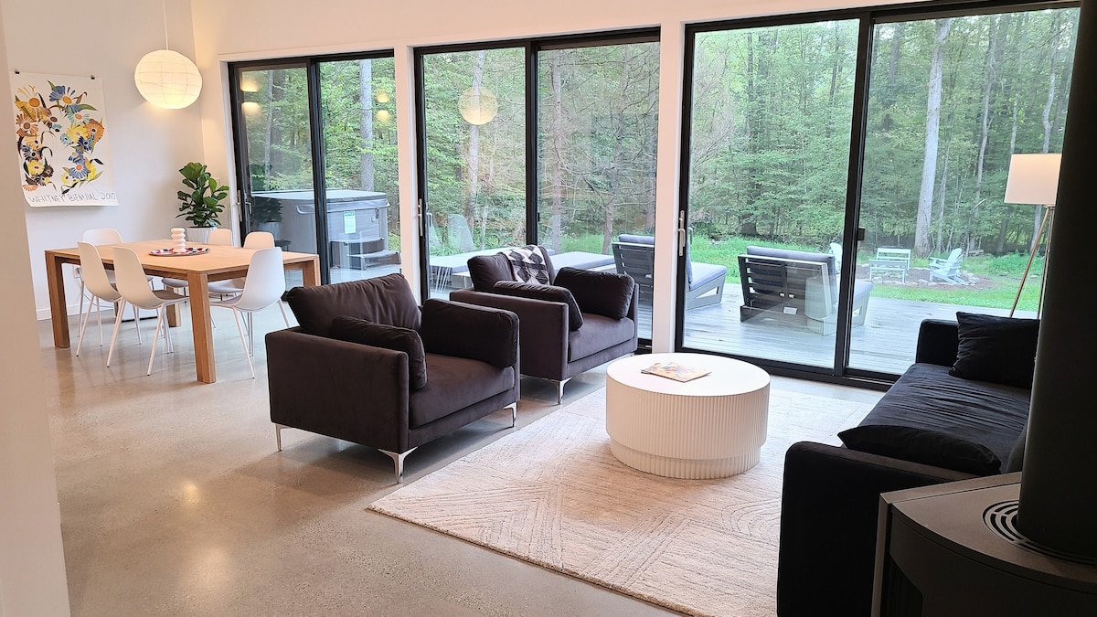 Escapade moderne dans les bois avec jacuzzi et brasero