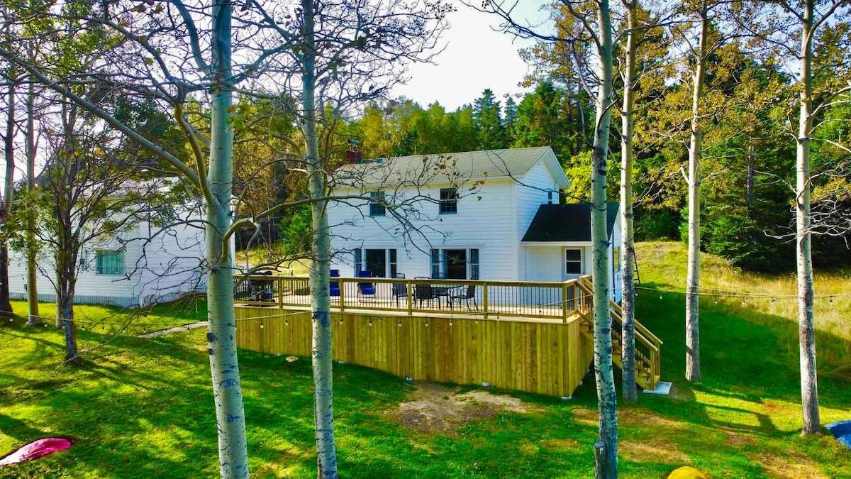 Nichée dans le refuge de la belle Wiseman's Cove à quelques minutes de Twillingate, notre grande maison confortable et propre en forme de A se trouve au bord de l'océan et dispose d'un accès direct à l'eau pour la pêche sur le rivage ou la flottaison/le rafting. Notre maison confortable offre une vue imprenable avec une gamme de fenêtres du sol au plafond donnant sur l'eau et les zones forestières environnantes, un foyer extérieur, un foyer électrique intérieur, des chambres spacieuses, une cuisine entièrement équipée et un coin repas, et un air centralisé pour le refroidissement/chauffage.