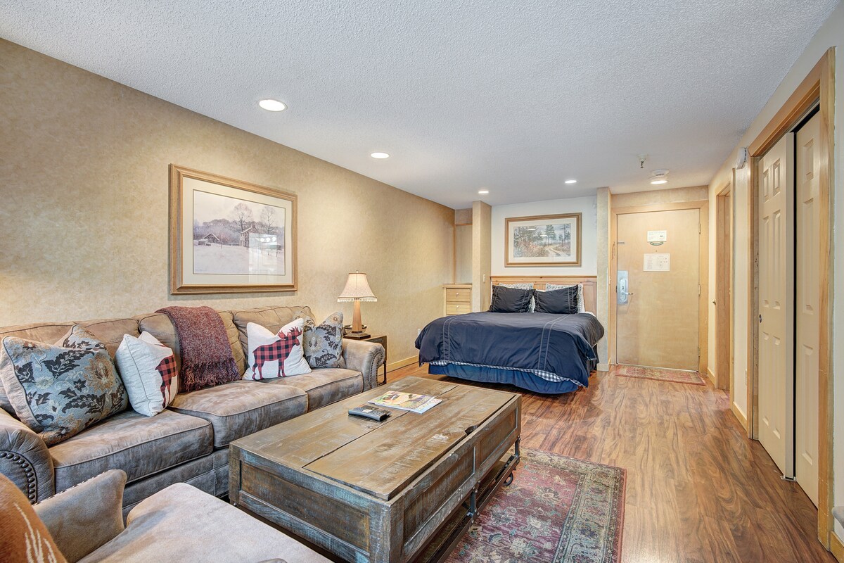 Les invités ont un accès complet à un beau studio au rez-de-chaussée avec loft (5 personnes) sur la route Four O' clock. 200 yrds de Snowflake Lift, avec un garage chauffé et un casier à ski. Vous pourrez également vous reposer et vous détendre confortablement dans le condo avec un lit queen-size murphy et futon à l'étage principal avec une cuisine pleine grandeur ainsi qu'un grand lit queen est situé dans le loft du condo, qui est accessible via une charmante échelle en bois intégrée.