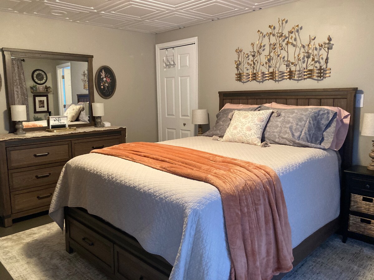 Le Traveler dispose de deux chambres avec des lits complets et des lits Queen Size, d'un salon spacieux avec une grande télévision à écran plat, d'une connexion Wi-Fi, de meubles d'extérieur dans le patio arrière, d'une cuisine entièrement équipée pour le petit-déjeuner et d'une salle de bain complète avec douche. Cette maison dispose également de soda, café, thé et eau en bouteille gratuits, petit déjeuner et collations. Nous veillons à ce que tout soit parfaitement propre pour nos voyageurs. Au moment du départ, il n'y a pas de lits à défaire, de linge à laver ou de sols à aspirer. Nous vous souhaitons un excellent séjour.