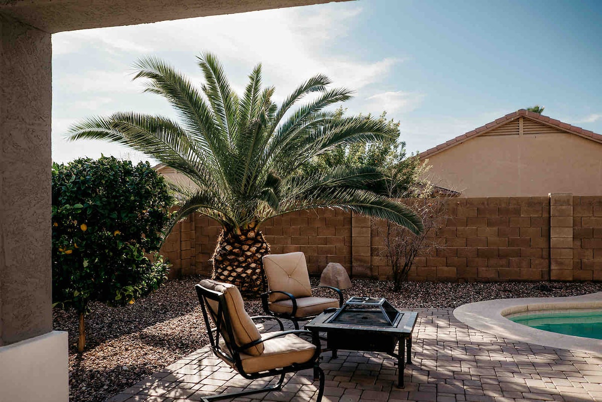 🏊 Year-round relaxation in heated saltwater pool & spa (gentle on skin/eyes) 🔥 Cozy up to fire features 🍳 Fully stocked kitchen + outdoor propane BBQ grill 🎱 Game room with pool table, foosball, darts, & big-screen TV 🌞 Outdoor dining area & bar for enjoying AZ weather 📺 Outdoor TV for games/movies while soaking in the spa 🚗 Easy access to 2 major freeways 🎨 Artfully & uniquely decorated Resort-like escape in Phoenix (Glendale mailing) – perfect for family, golf trips & holidays