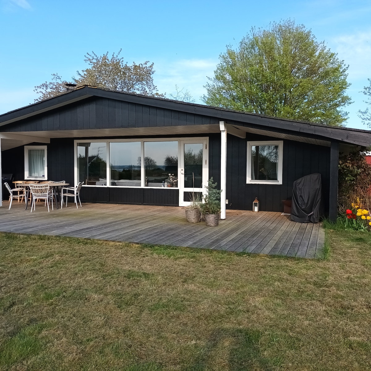 Chalet moderne, pratique, romantique et confortable dans un bel emplacement à la plage sur l'île de Thurø avec chargeur de voiture électrique (Type 2 avec 16A 11 kW), terrasse extérieure complète, pelouse verte, parking gratuit illimité, unité de climatisation partagée pour le chauffage / climatisation pratique, Wi-Fi, cuisine équipée, cuisinière à bois, salle de douche, sèche-linge et lave-linge. Thurø dispose d'un accès routier facile à Svendborg.