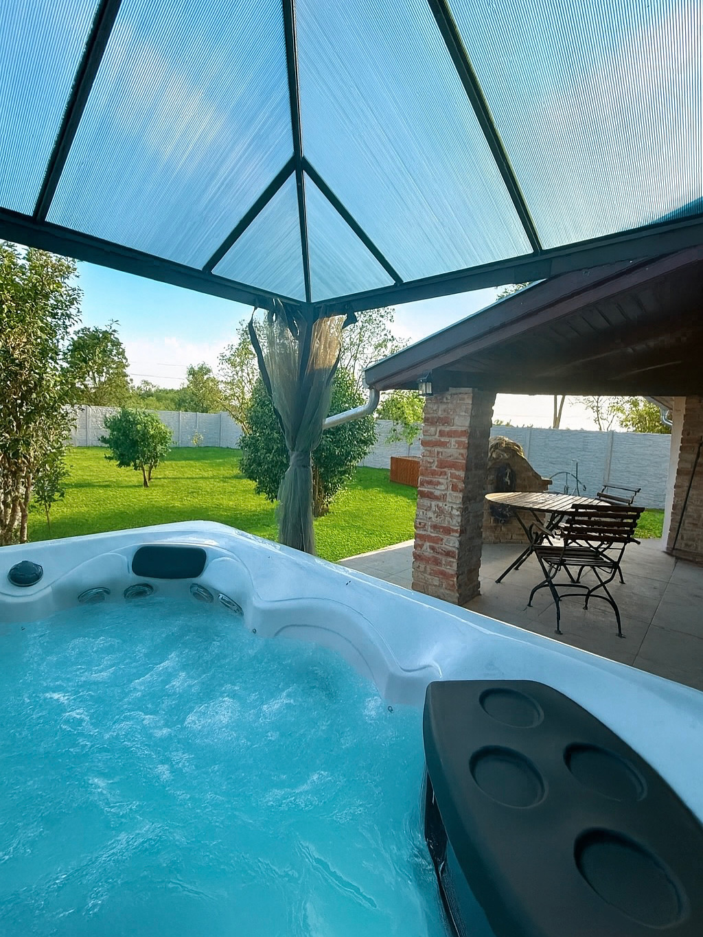 A teljesen légkondicionált ház közel 300 nm-es, 2 szinten 6 szobával, 5 fürdőszobával, 2 tágas nappalival és 2 gépesített konyhával. A gyerekeknek a 60nm-es galériát kuckónak alakítottuk ki. A ház télikert hangulatú étkezője 12 fő számára kényelmesen birtokba vehető. A méretes ablakokon át érezhetjük a Csodát, a természet békéjét és csendjét. A fűtött 60nm-es teraszon a 10 személyes elektromosan fűthető dézsa, pihenő kanapék és étkező is van. A kertben ott a strandröplabda pálya és a lovak is.