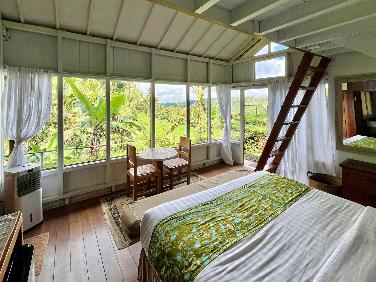 Un paisible Emerson privé dans la nature Une belle cabane indépendante de 2 niveaux nichée à côté de la forêt tropicale de Batukaru. La cabane offre une vue imprenable sur la forêt tropicale avec de belles fenêtres partout pour faire entrer la lumière et admirer la vue ! Idéal pour 1 à 2 personnes, 2 personnes supplémentaires peuvent dormir à l'étage sur des canapés-lits de jour. Détendez-vous dans ce logement unique et tranquille ou travaillez à distance avec le Wi-Fi dans toute la propriété. Observation des oiseaux dans la forêt tropicale à 3 minutes à pied.