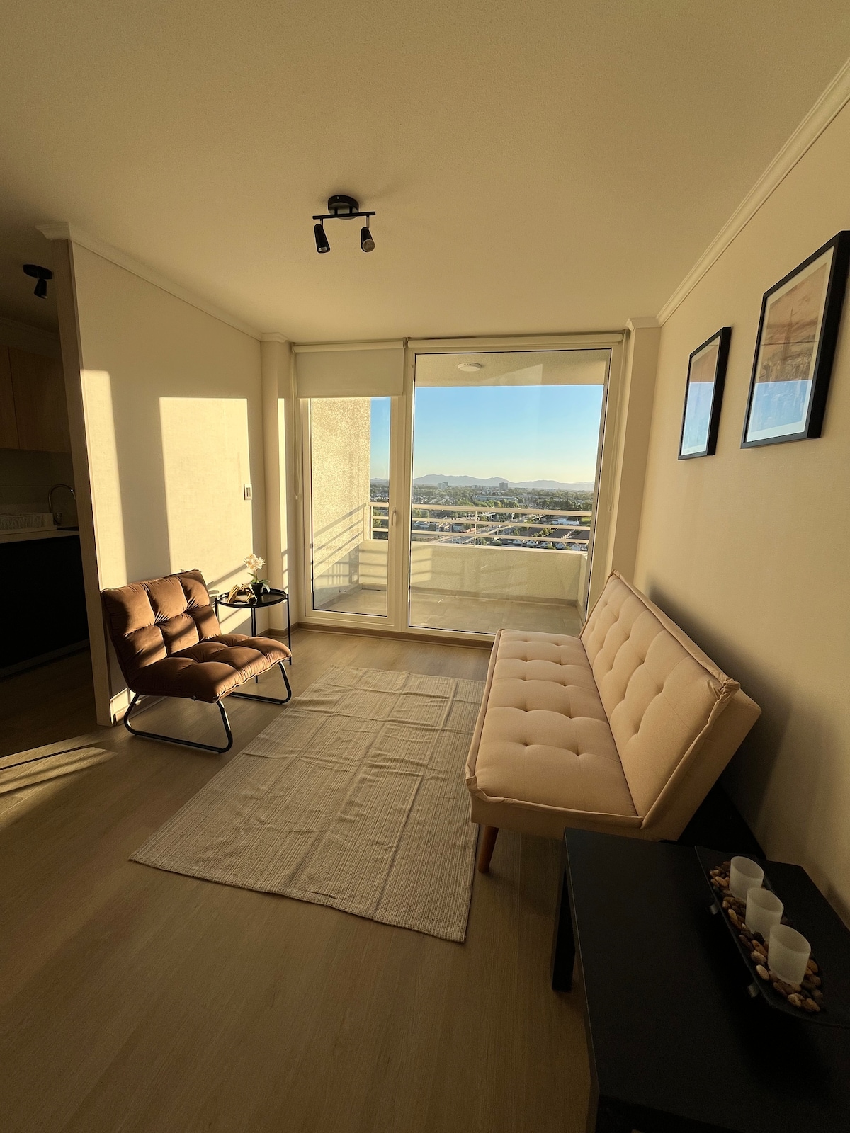 Bel appartement avec belle vue, idéal pour les voyages ou le travail ! Situé dans une copropriété sécurisée dans le secteur Las Rastras à 3 minutes du Mall Plaza Maule et du casino. Il dispose de : -Ascenseur, piscine, quincho -1 parking -1 chambre avec lit 2 places -Walk in closet avec 1 salle de bain en suite - Cuisine entièrement équipée -Living / salle à manger cosy - Terrasse avec belle vue