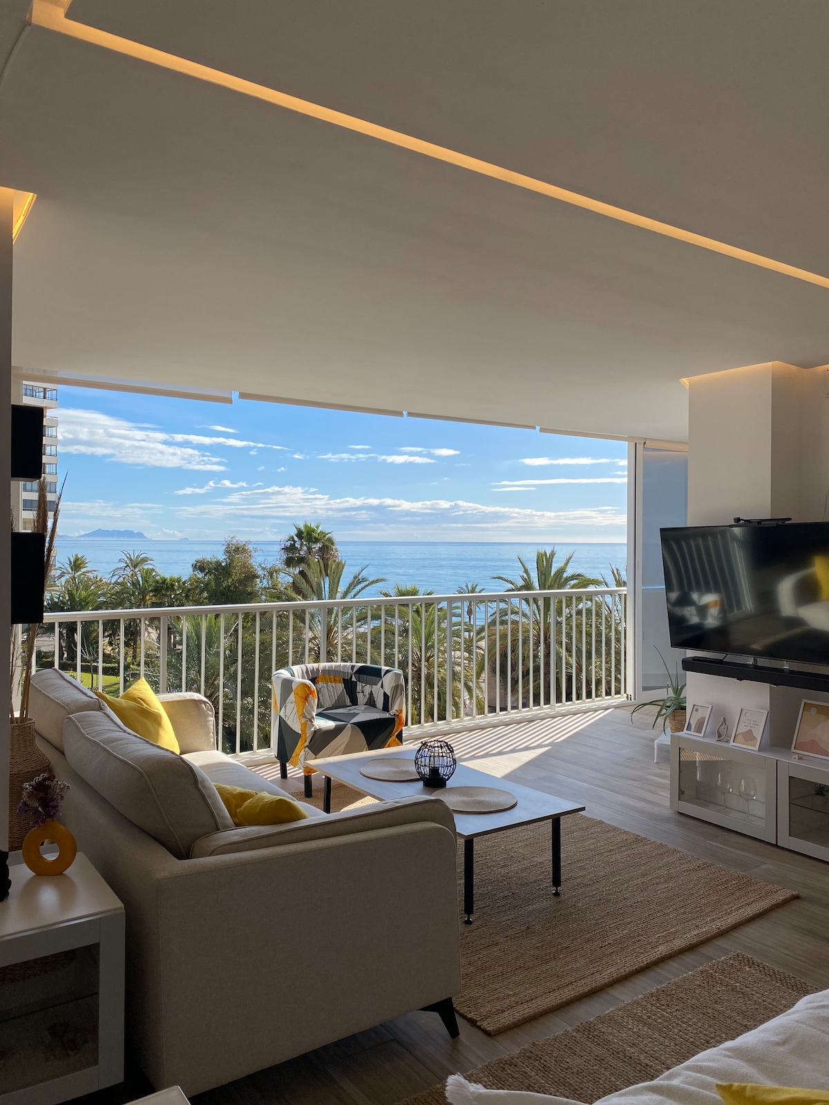 Magnifique appartement rénové moderne et confortable en front de mer, vue imprenable, dans la meilleure zone de la plage avec climatisation et chauffage dans l'urbanisation avec piscine et padel, aire de jeux, place de parking dans le bâtiment lui-même. Promenade piétonne sur la porte sans voitures ni tramway, entouré de restaurants, de pharmacie dans la même rue, de supermarchés et de zones commerciales. Nº d'enregistrement VT-453714-A catégorie E.