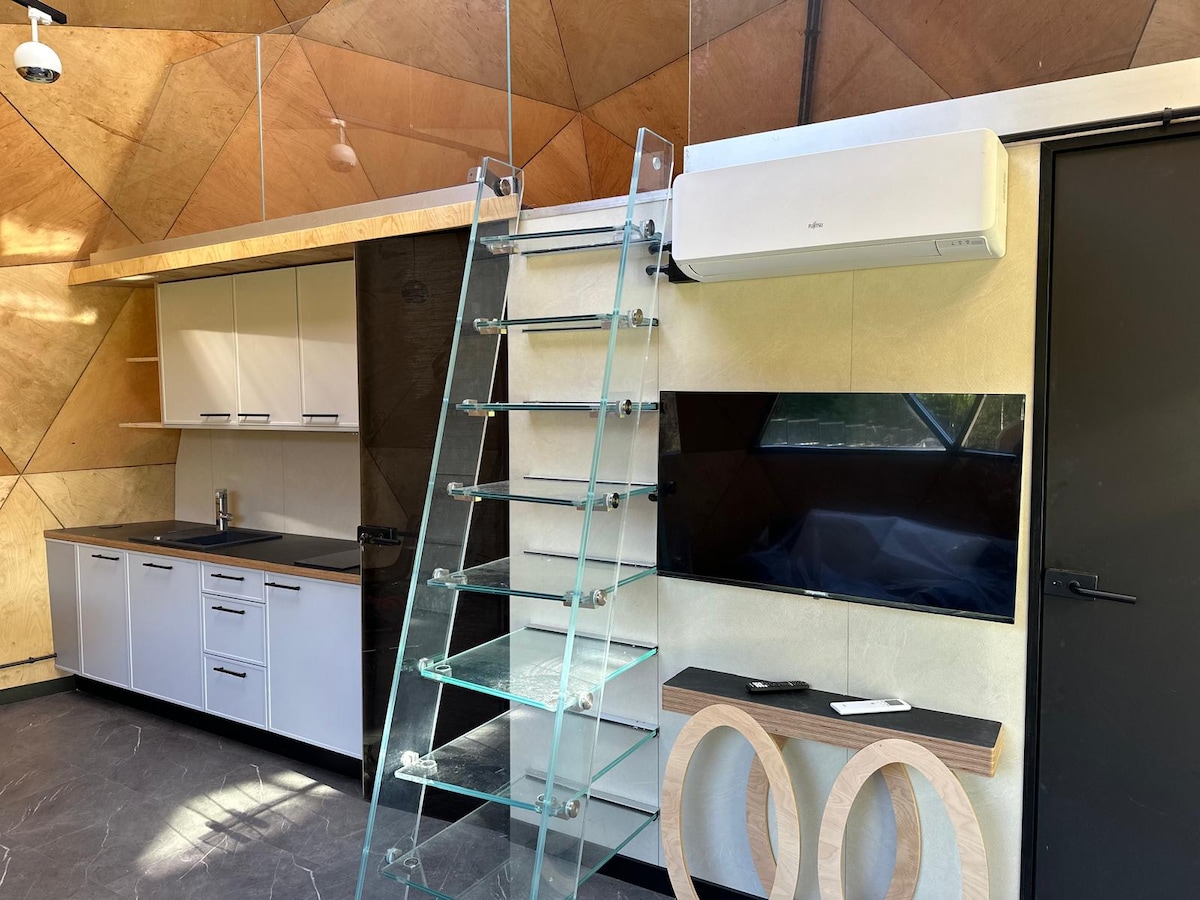 Nous vous offrons un séjour dans un incroyable cottage sphérique ! C'est un endroit où séjourner avec vue panoramique sur les étoiles et les montagnes russes, le plus proche du parc d'attractions Energylandia. Un hébergement unique dans toute la Pologne ! Le chalet sélectionné dispose d'une terrasse donnant sur les montagnes russes, où nous avons un barbecue et une chaise longue. Spherical Cottage number 21 se distingue par un niveau élevé et un JACUZZI ! Capacité maximale : 4 + 1 (lit d'appoint possible) Lits : chambre : 2 personnes ; salon : canapé-lit pour 2 personnes Superficie : 36 m2