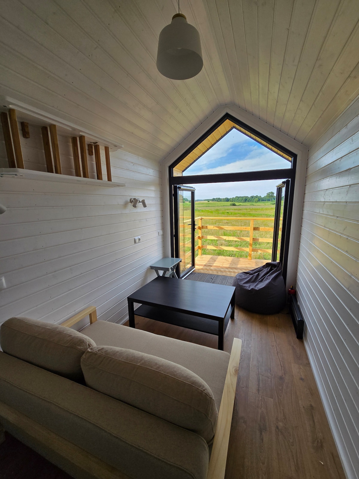 2 cottages pouvant accueillir jusqu'à 8 personnes disposent d'une immense terrasse d'une superficie de plus de 30 m2, équipée de chaises, d'une table de banquet et d'un gril à gaz, le tout avec une belle vue sur l'immense espace de champs, de prairies et de forêts. Tout est conçu pour que votre arrivée et votre repos se déroulent sans souci. Cet endroit est le berceau des oiseaux nobles, et nous sommes également souvent visités par des chevreuils, des lièvres et des renards. C'est également un endroit idéal pour un festin ou un rassemblement social sur la terrasse, près du feu ou dans la nature environnante