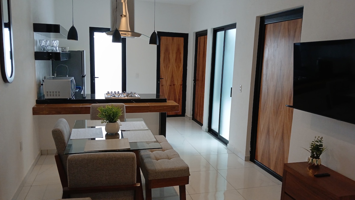 Disfruta una estancia cómoda y sin preocupaciones en este departamento moderno, ideal para 1 a 4 huéspedes. Ofrece 2 recámaras amplias, una con baño privado, sala-comedor luminosa con TV, y cocina totalmente equipada con barra desayunadora. Incluye aire acondicionado, lavadora y secadora. Ubicado en un ambiente tranquilo, perfecto para descansar, trabajar o disfrutar la ciudad con total comodidad.