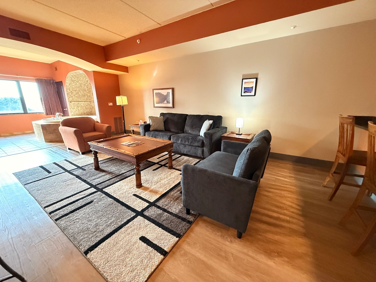 Retraite confortable au bord de la rivière Notre chambre spacieuse est parfaite pour les familles ou les groupes jusqu'à 6 personnes. Détendez-vous sur votre balcon privé, sur deux lits Queen Size ou sur un canapé-lit confortable, et profitez de la commodité d'un micro-ondes et d'un mini-réfrigérateur. Avec une vue imprenable sur la rivière, vous aurez tout ce dont vous avez besoin pour passer un séjour confortable et agréable. En été, profitez de notre piscine à vagues extérieure, de deux autres piscines, d'un patio commun et de grils.