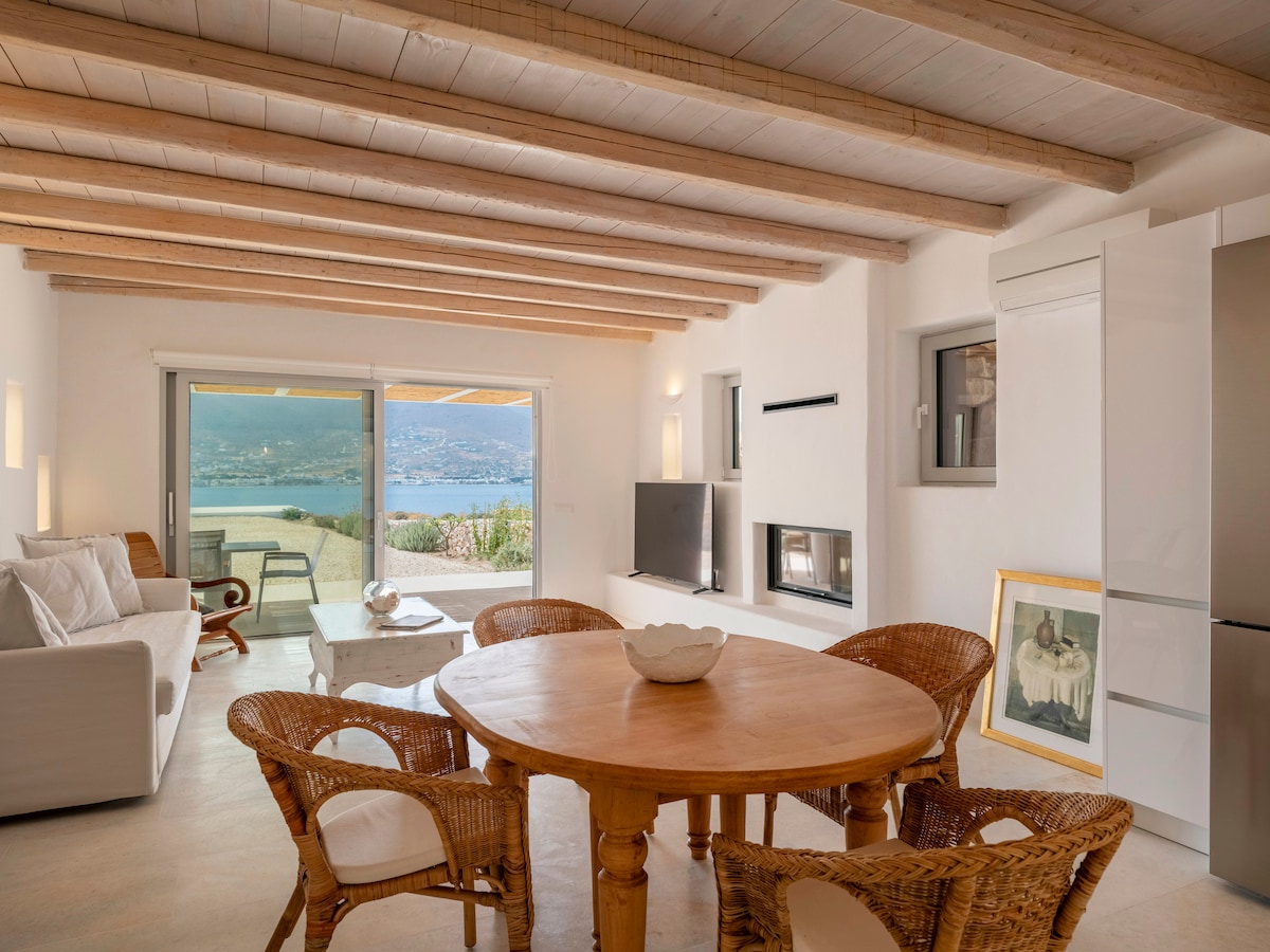 Bienvenue dans notre toute nouvelle villa au bord de l'eau !! Située dans la partie luxueuse de l'île, dans la région de Kalafatis, à 4 minutes à pied de la plage. Rendez votre séjour mémorable en profitant des plus beaux couchers de soleil et de la vue sur l'océan depuis votre piscine privée. 4 chambres, toutes avec salles de bain privée et climatisation. Le luxe rencontre le style traditionnel pour que vous vous sentiez comme chez vous. À 5-10 minutes en voiture d'Ano Mera, des marchés et de la plupart des plages du sud. Nous organisons également tout type de service comme le transport privé 24h/24 et 7j/7.