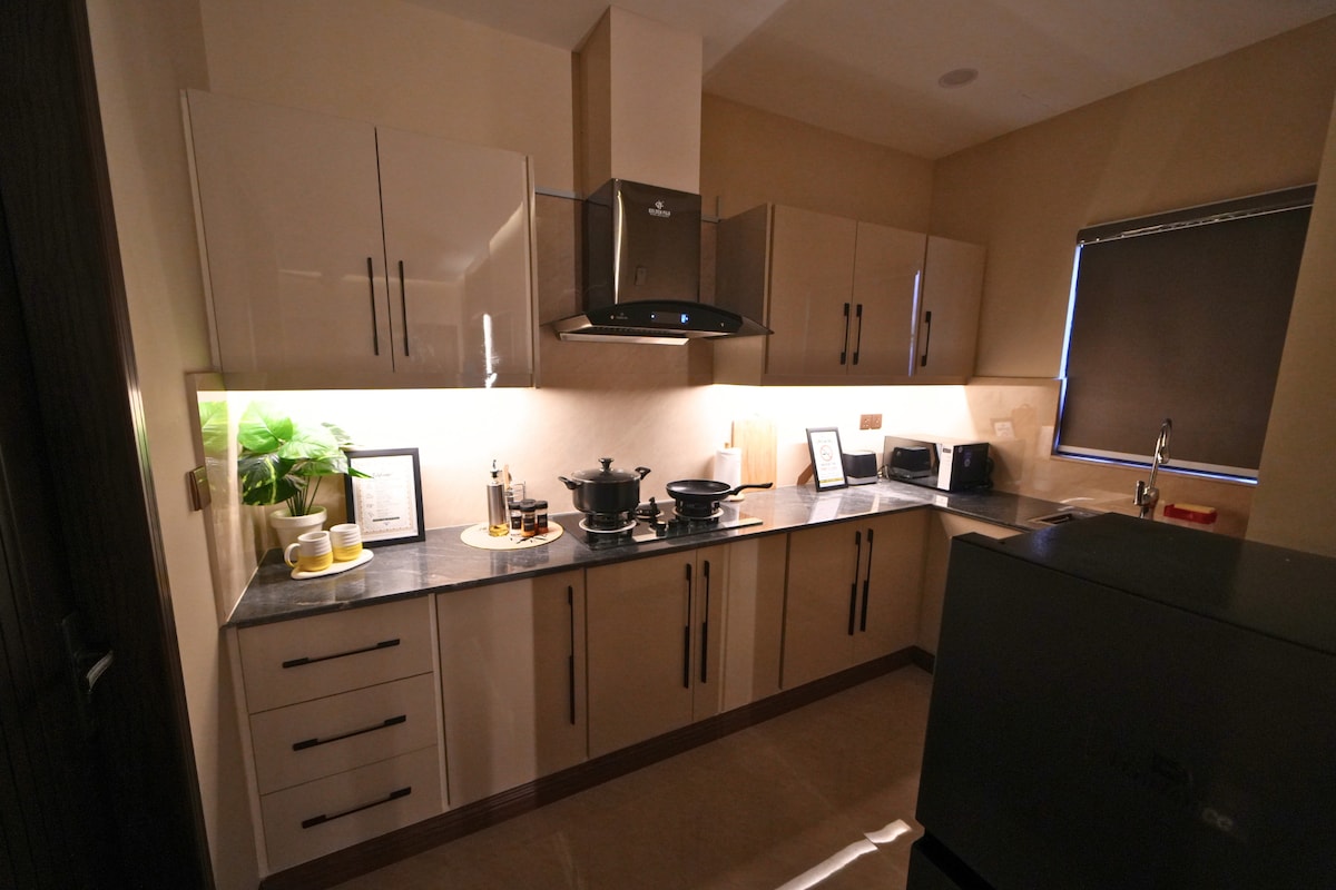 Appartement 1 pièce design chic | Piscine à débordement I Ambiance de luxe ✨ Lit King Size et balcon privé Télévision connectée📺 55" et Wi-Fi ultra-rapide (30 Mbps) 🍳 Cuisine entièrement équipée ❄️ Climatiseurs et eau chaude Serrures 🔒 intelligentes et décoration moderne 🏙️ Au-dessus de l'aire de restauration du centre commercial Zeta, à quelques pas du centre commercial Giga Vues 🌄 panoramiques sur les collines Parfait pour les familles et les voyageurs d'affaires. CNIC obligatoire (18ans et plus). Interdiction de fumer/fêtes. Réservez maintenant pour le confort et le style !