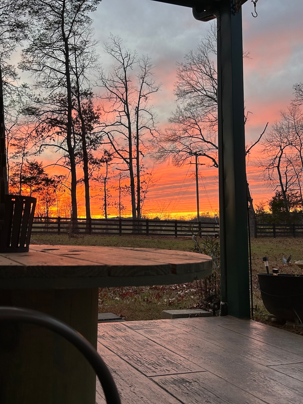 Du grand patio couvert de ce petit chalet, vous pourrez observer les chevaux, voir notre plus grand étang, manger vos repas si vous le souhaitez, et admirer la beauté de la nature. Vous pouvez également réserver notre patio de jacuzzi, nager dans notre ruisseau, pêcher dans nos étangs, parcourir nos nombreux kilomètres de routes de ferme et de sentiers boisés, utiliser notre Game Barn et siroter du vin en regardant le soleil se coucher derrière les montagnes.