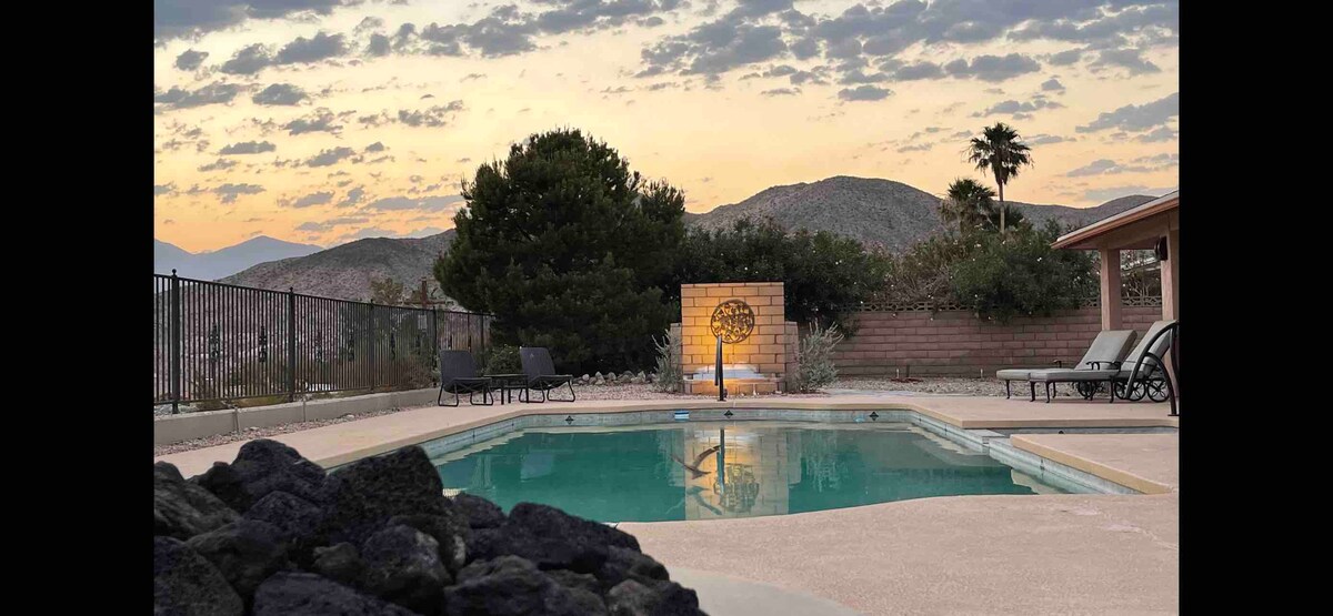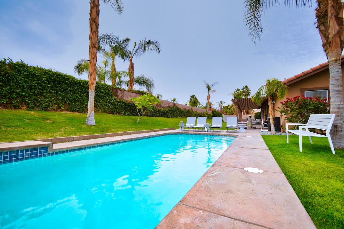 Escape to your private desert oasis—where sunshine, palm trees, and peaceful golf-course views create the perfect Indio getaway. 💦 Saltwater pool & free spa heating 🎮 Game room: pool table, ping pong, arcade & smart TV 🛏️ Sleeps 10: 2 Kings, 1 Queen, Queen+Full bunk 🍳 Chef’s kitchen + coffee bar 🔥 Fire pit, BBQ, outdoor dining & lounge 🎾 Tennis, pickleball & gym (4 guests) 🚗 Near Indian Wells, La Quinta & Joshua Tree