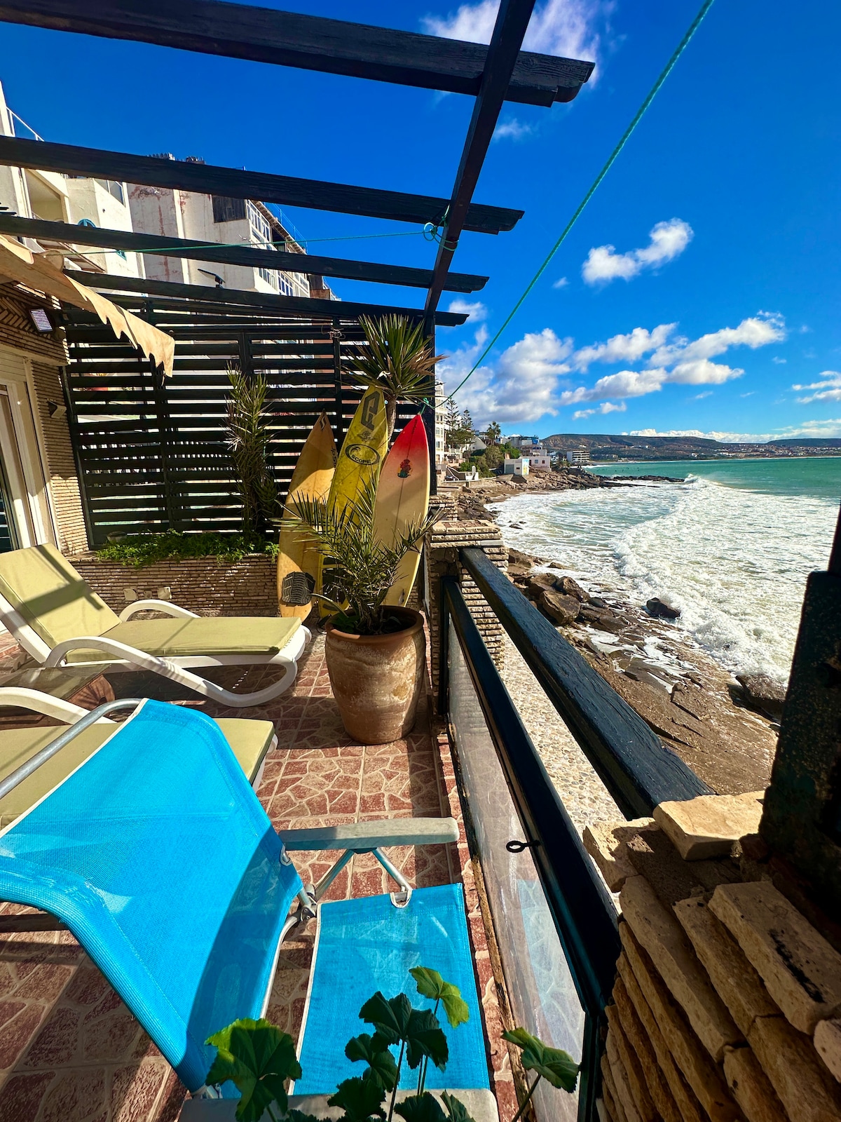 C'est le seul appartement dont le balcon est construit au dessus du chemin qui longe la plage, offrant une vue exceptionnelle sur les vagues, le village, les pêcheurs, les surfeurs (devant le spot Hash point). Très confortable, décoré et entretenu avec soin pour un séjour exceptionnel au dessus de l'océan, proche des nombreux cafés et restaurants longeant la plage et à 2 pas des écoles de surf, au coeur de ce village berbère convivial mêlant pêcheurs, commerçants, surfeurs du monde entier.