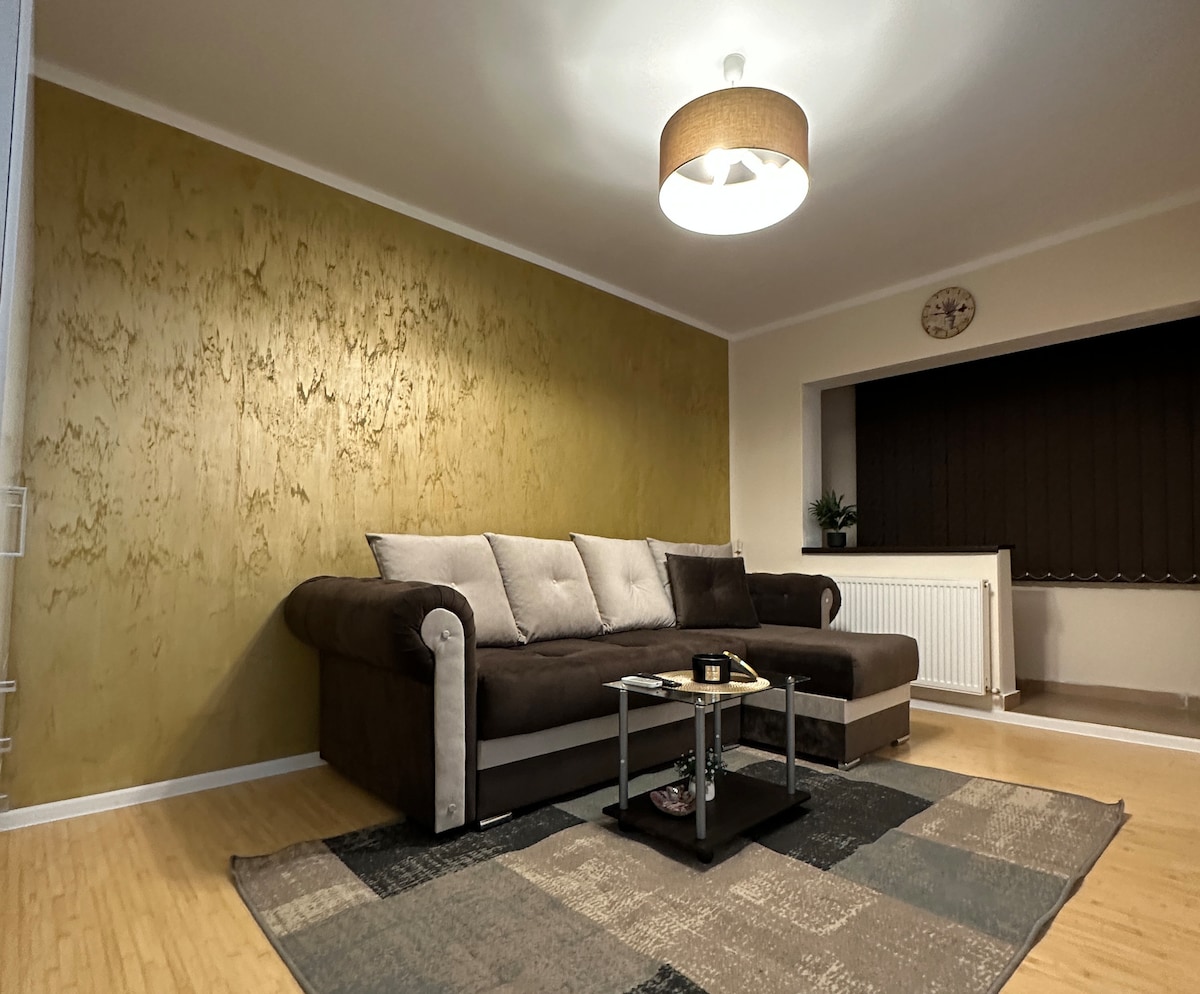Appartement neuf lumineux avec un design moderne et un parking gratuit. Elle est située à l'entrée de Timisoara, dans le quartier de la station-service Esso. L'appartement est équipé de : - Cuisine entièrement équipée avec tout le nécessaire : plaque de cuisson électrique, four, lave-vaisselle, réfrigérateur, machine à café et vaisselle. - Lavabo ouvert où les voyageurs peuvent profiter d'un film, sur un canapé confortable, sur une télévision intelligente - Chambre avec lit King Size ; - Bébé avec cabine de douche et lave-linge avec sèche-linge.