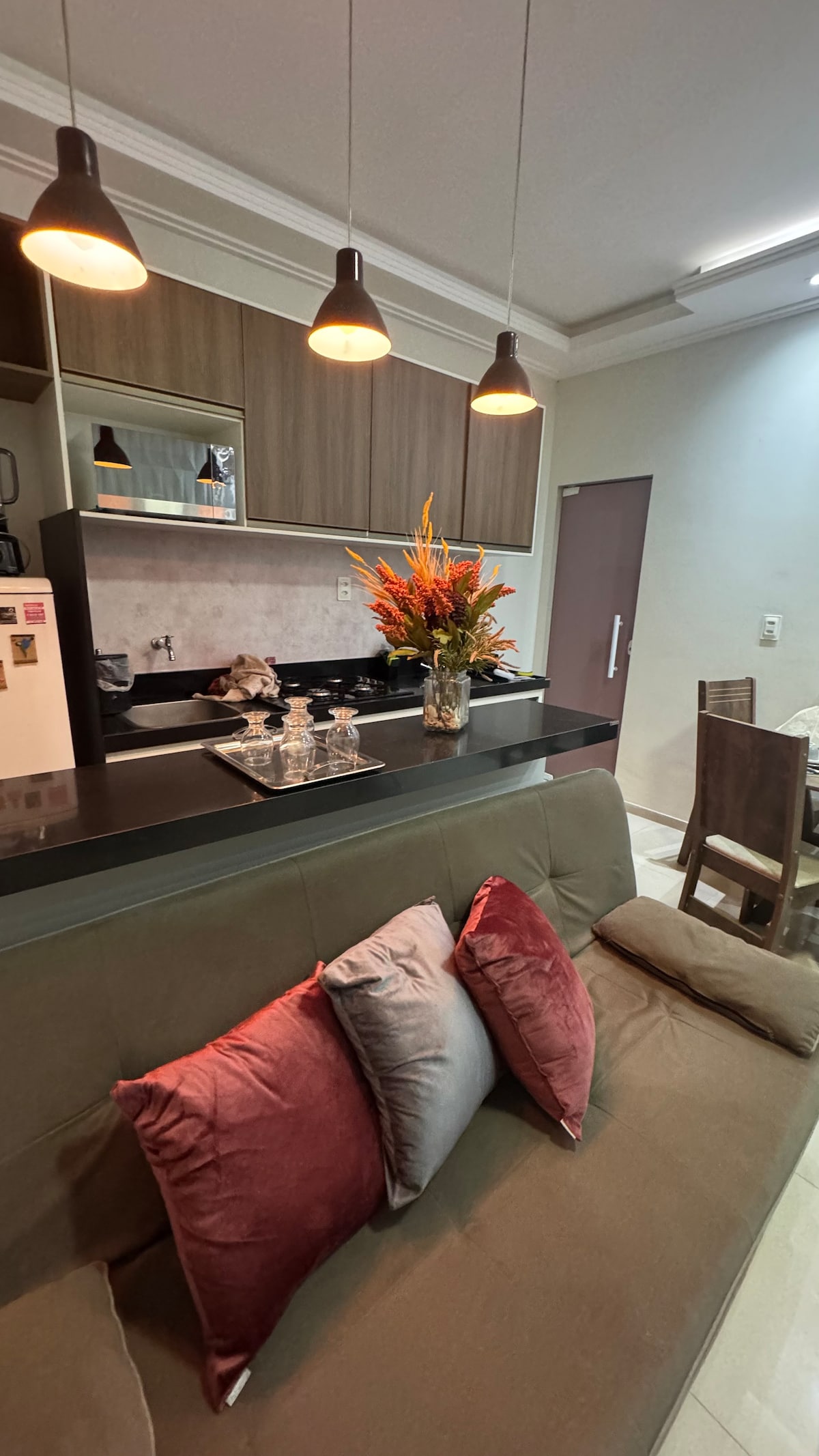 Si vous recherchez une ambiance familiale, calme, sûre, proche des cliniques, des hôpitaux et des commerces en général dans le CENTRE, VOUS L’AVEZ TROUVÉE !SALLE À MANGER : une table à manger qui peut être utilisée comme table de travail, deux chaises, un minibar, un micro-ondes, une fenêtre et un miroir ; CHAMBRE : lit double, armoire, smartwatch TV Samsung 32 pouces, fenêtre et climatisation split ; SALLE DE BAIN avec accessoires ; CUISINE : réfractaire, sandwich maker, évier, blender, cafetière, couverts, verres, tasses, et il n'y a pas de cuisinière ou de casseroles. GARAGE : 5,15 mètres