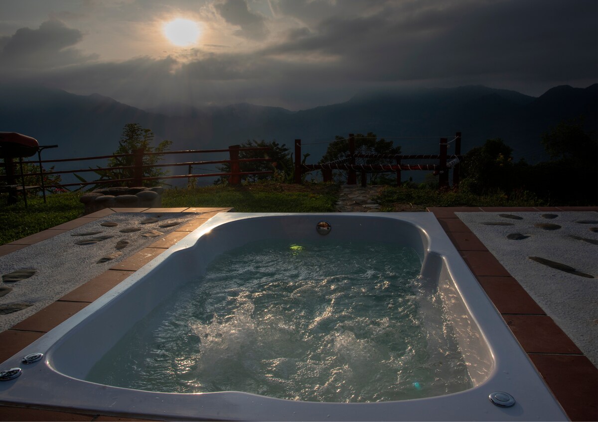 Relájate en esta acogedora cabaña rodeada por tierras cafeteras, de naturaleza y tranquilidad. Cuenta con cocina dotada, habitación con cama doble y TV, baño abierto natural, sala exterior, jacuzzi, malla catamarán y zona verde. Además, dispone de wifi de 300 MB ideal para trabajar remoto o mantenerte conectado durante tu estadía. También ofrecemos servicio de alimentación adicional. Perfecta para escapadas románticas, descansar o combinar trabajo y naturaleza lejos del ruido de la ciudad.