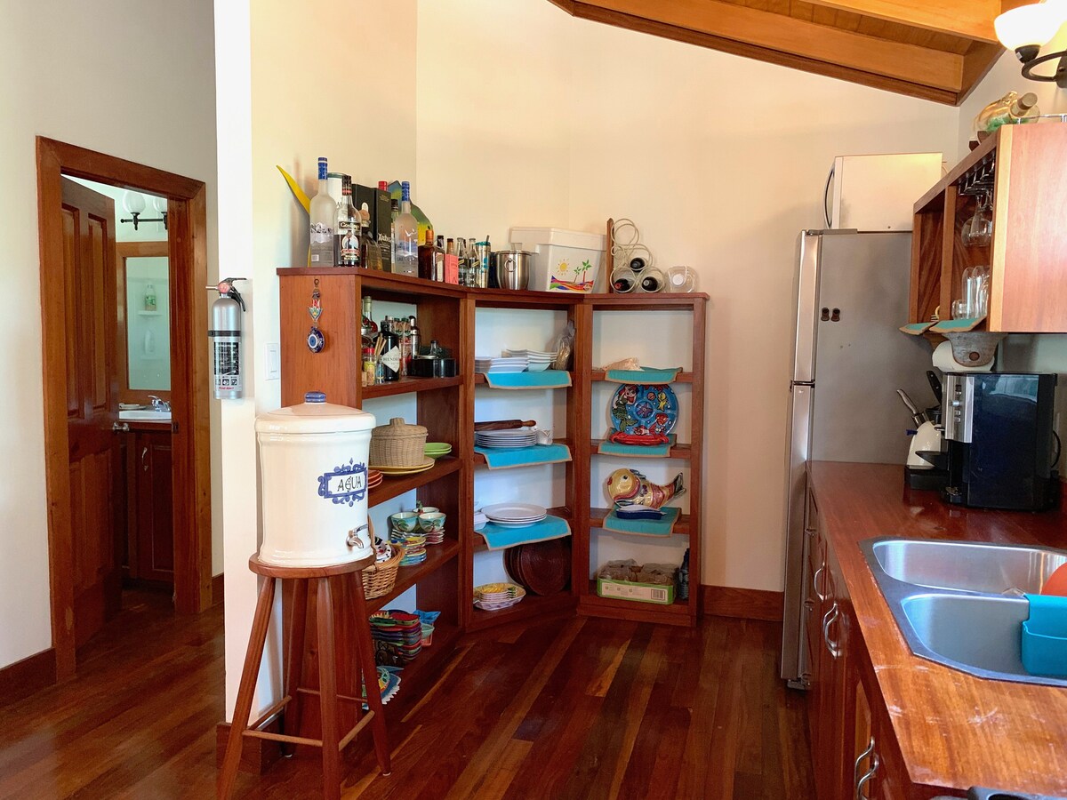 You have the 2nd floor of a large 3 story home at the north end of Placencia Village. 2 Bedrooms, 2 full baths. Air conditioning throughout. Full sized, well stocked kitchen. Ample indoor & outdoor space. Pool & sun deck just steps from your back deck . Ideal location; one minute walk to the lagoon, 3 minutes to the famous Sidewalk and the Sea. Tour operator with golf cart rentals next door. Coffee shop & grocery store right across the street. Free bikes & no Airbnb service or cleaning fees!