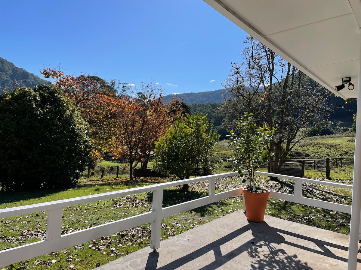 Situé au milieu de la forêt du mont BawBaw, les voyageurs découvrent la sérénité de notre paysage naturel. Profitez d'un paysage sonore d'oiseaux, admirez un ciel nocturne éblouissant, faites de longues promenades à travers la forêt, visitez notre cascade locale et détendez-vous avec des gens que vous chérissez autour de notre cheminée dans un intérieur charmant et rustique. Nous vous avons réglé avec du linge de lit, du bois de chauffage, Internet via satellite, de l'électricité 240 V via notre système solaire, des graines d'oiseaux pour nourrir les perroquets et tous les équipements de cuisine et de salle de bain dont vous aurez besoin !
