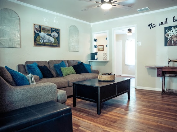 Construite en 1945, notre maison est une maison de style chalet artisanal située dans le quartier Old Elmwood d'Abilene. Notre maison est entièrement meublée avec un style confortable pour que vous vous sentiez comme chez vous. Notre maison est à 5 minutes de l'Université McMurry et à 10-15 minutes en voiture de l'ACU et de l'Université Hardin-Simmons. Accès des voyageurs Les voyageurs sont invités à utiliser l'ensemble du logement, y compris les deux chambres, la cuisine, le salon, la salle à manger, le lave-linge/sèche-linge et le patio arrière. Arrivée autonome avec serrure connectée.