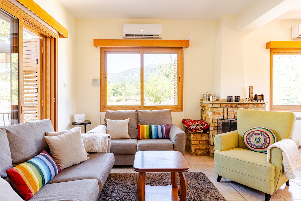 Elle est située dans un endroit impressionnant au cœur de Chypre (à 15 minutes de Troodos, 30 minutes de Limassol, 55 minutes de Nicosie). Grâce à son emplacement unique, vous pouvez profiter du soleil sans ressentir la chaleur. C'est un choix parfait pour les voyageurs qui veulent se détendre et aussi pour les voyageurs qui veulent voyager à travers Chypre ! Tous nos clients peuvent consulter un guide qui montre de merveilleux endroits à visiter que seuls les habitants connaissent !