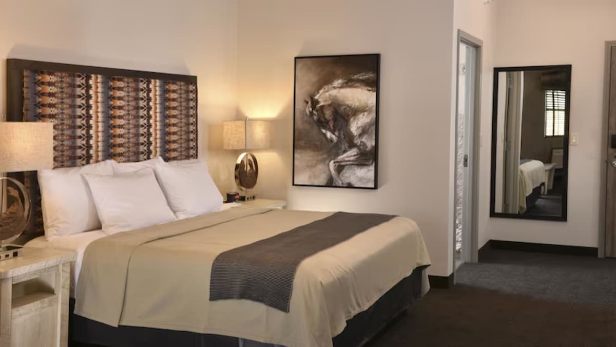 Une expérience de boutique-hôtel vous attend !! Que vous prévoyiez de conclure une affaire importante ou d'assister à un événement unique, la chambre King Luxe du Mayo est le moyen idéal de terminer une journée. Alliant commodité et style, ces logements surdimensionnés offrent un lit King Size confortable, un espace de bureau et une cuisine de majordome avec un four à micro-ondes, un évier et un petit réfrigérateur, le tout enveloppé dans 450 à 650 pieds carrés de confort.