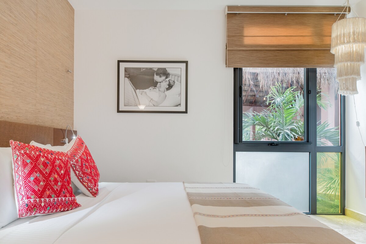 Détendez-vous et rechargez-vous dans cette élégante oasis de 2 chambres dans le complexe exclusif de Tao Tulum à Aldea Zama, une enclave paisible de la jungle à quelques minutes de la plage et des meilleurs restaurants de Tulum. 🌊 Grande piscine + jacuzzi + coin barbecue. Des intérieurs 🛋 spacieux et modernes avec des touches de design local. Système de climatisation 🌿 écologique (Sensibo). 🍳 Cuisine entièrement équipée + balcon pour le café du matin. 🏋️♀️ Accès à la salle de sport + deux piscines communautaires.