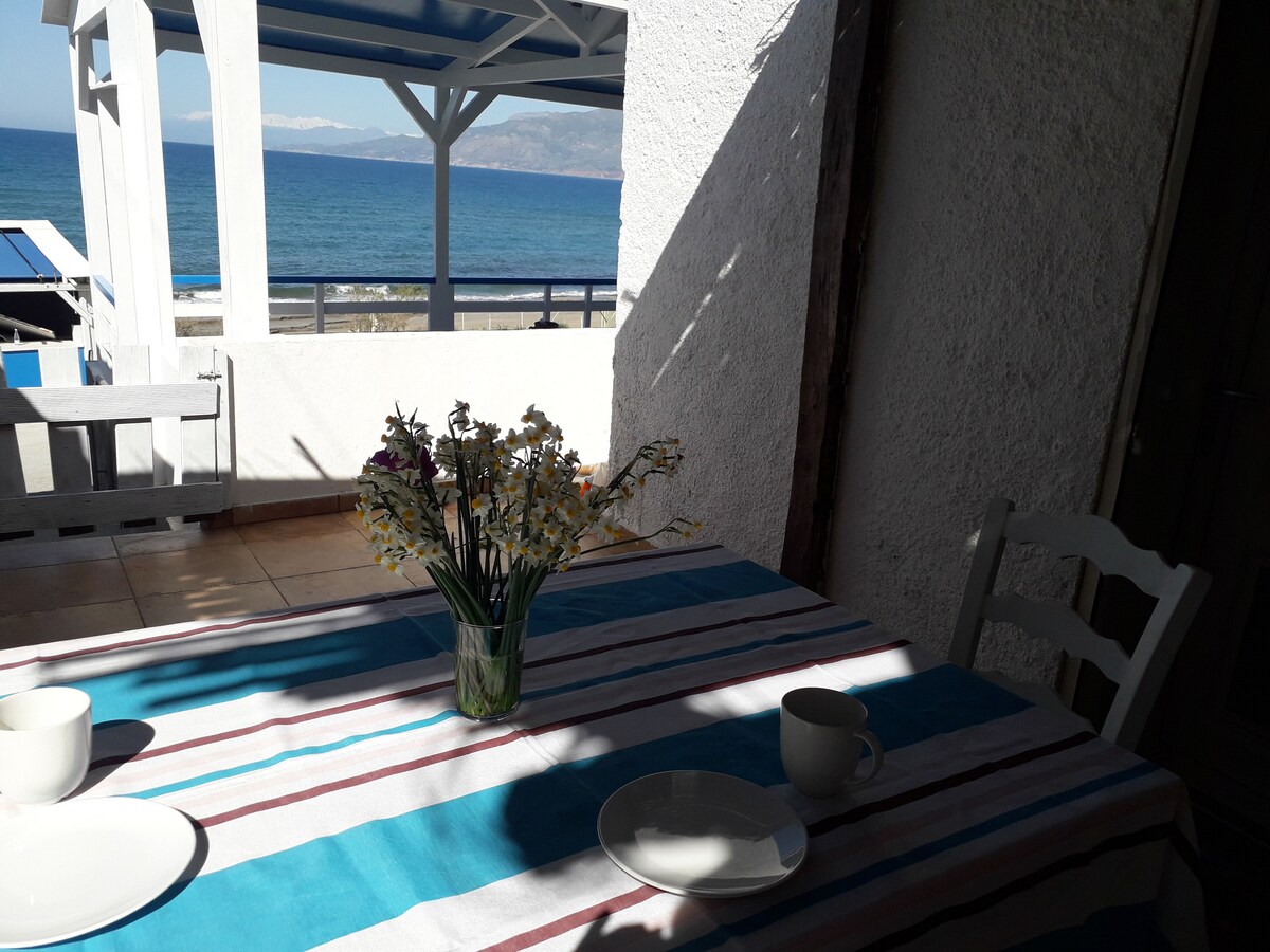 Studio indépendant avec mezzanine, le lit double est situé au rez-de-chaussée et les deux lits simples dans la mezzanine, salle de bain, cuisine, cour confortable face à la mer et à l'arrière de la maison. La maison est située à côté de la taverne Avra et il est très facile de la trouver. L'avantage de la maison, c'est qu'elle est située juste en face de la mer.