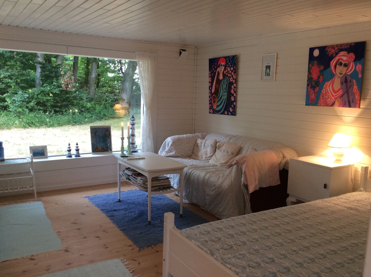 Profitez de la tranquillité de la maison de jardin confortable. Profitez de la vue sur le fjord et écoutez les oiseaux chanter dans le jardin. Détendez-vous complètement et découvrez la nature de près. Dans cette maison de vacances, il y a de la hauteur sous plafond et de l'espace pour se détendre de la vie quotidienne. Vous aurez votre propre petit coin de jardin pour vous détendre. Ici, tout est conçu pour créer confort et tranquillité. Nouveau lit confortable, cuisinière, réfrigérateur et congélateur, espace de travail, wi-fi gratuit (fibre) et parking gratuit. La salle de bain est à vous seul et est située à quatre mètres de l'annexe, avec une entrée discrète.