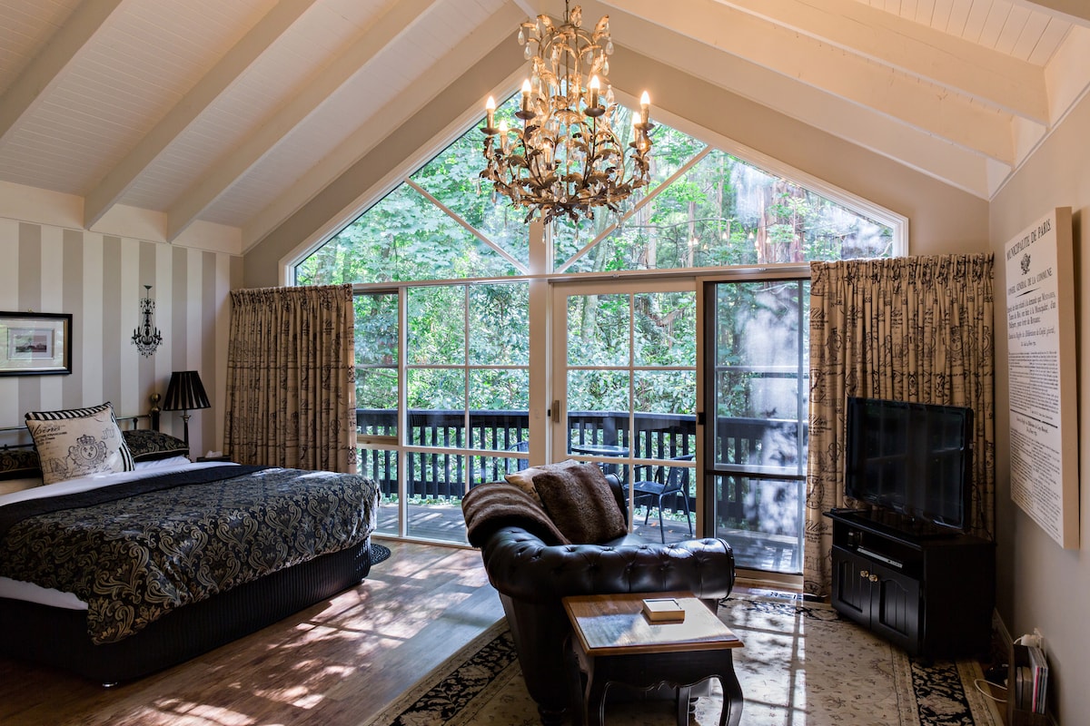 Ce chalet confortable offre une vue imprenable sur les Dandenong Ranges et la luxuriante vallée de Yarra. Doté d'un lit king size luxueux et d'un spa privé (peut être ajusté pour se rafraîchir en été et chaud en hiver), c'est l'escapade romantique parfaite. Dégustez un verre de vin dans la terrasse tout en admirant les paysages magnifiques, ou détendez-vous dans le spa après une journée à explorer les attractions locales. Avec sa décoration charmante, ce chalet est la retraite ultime pour les couples.